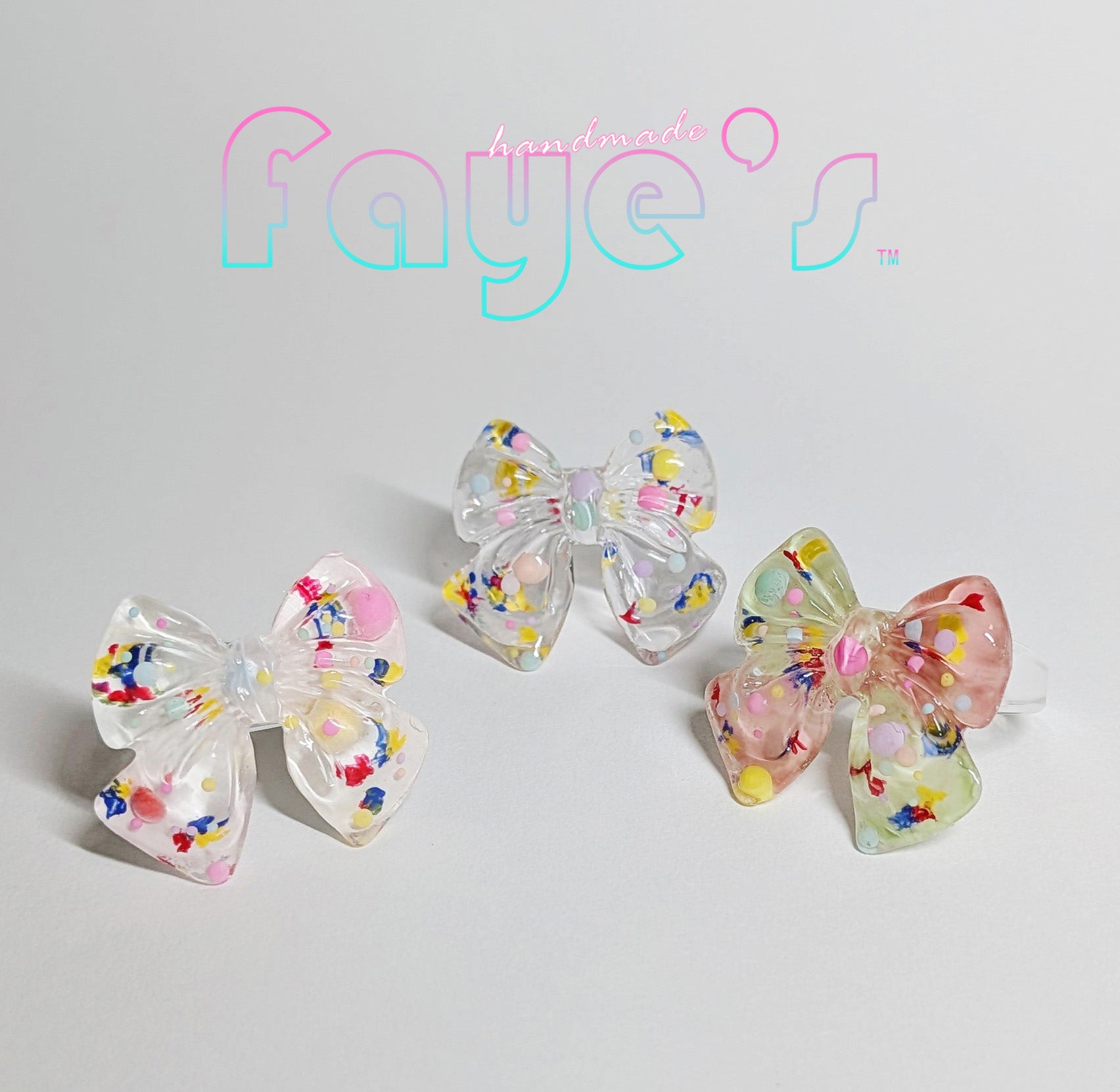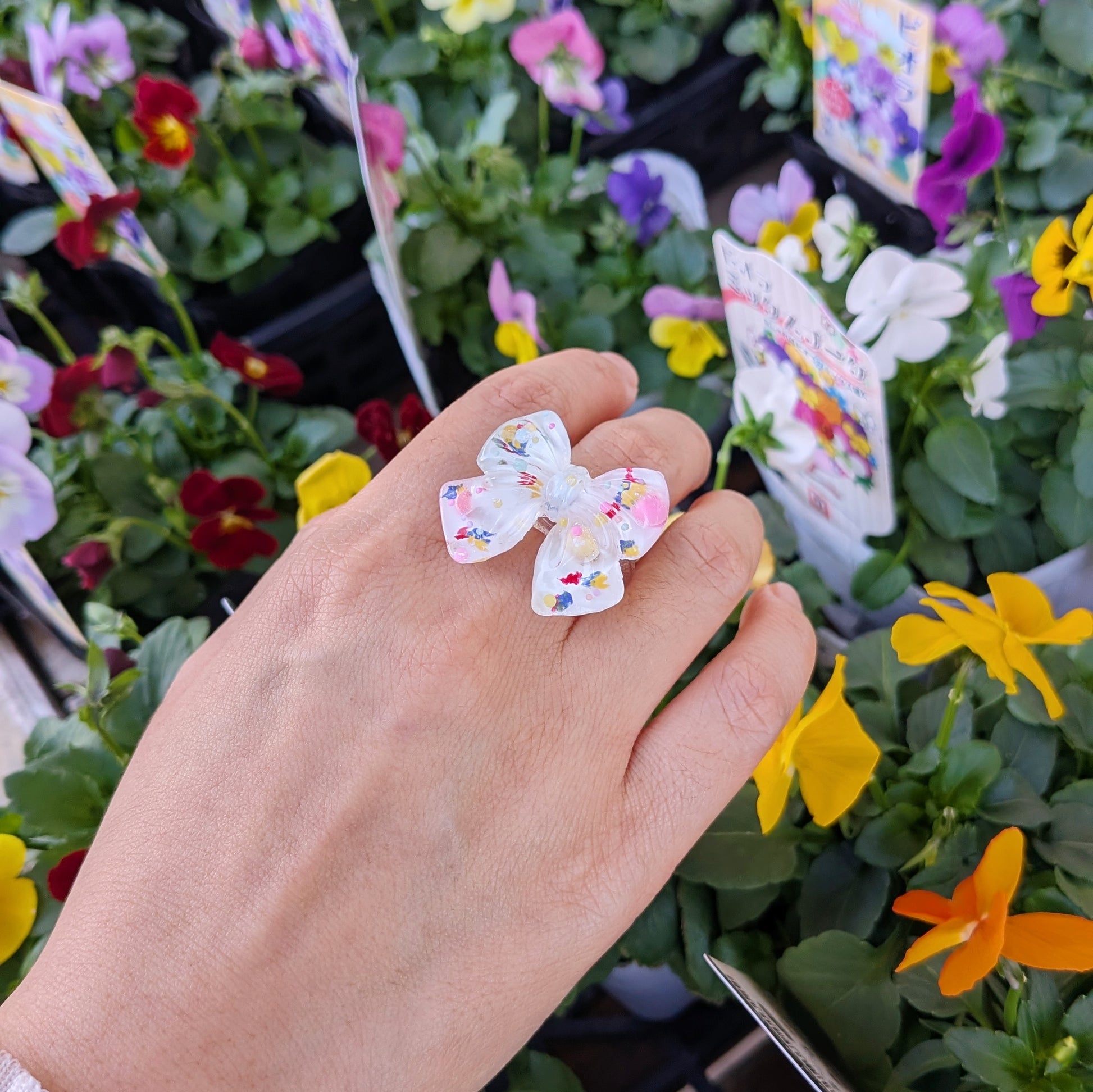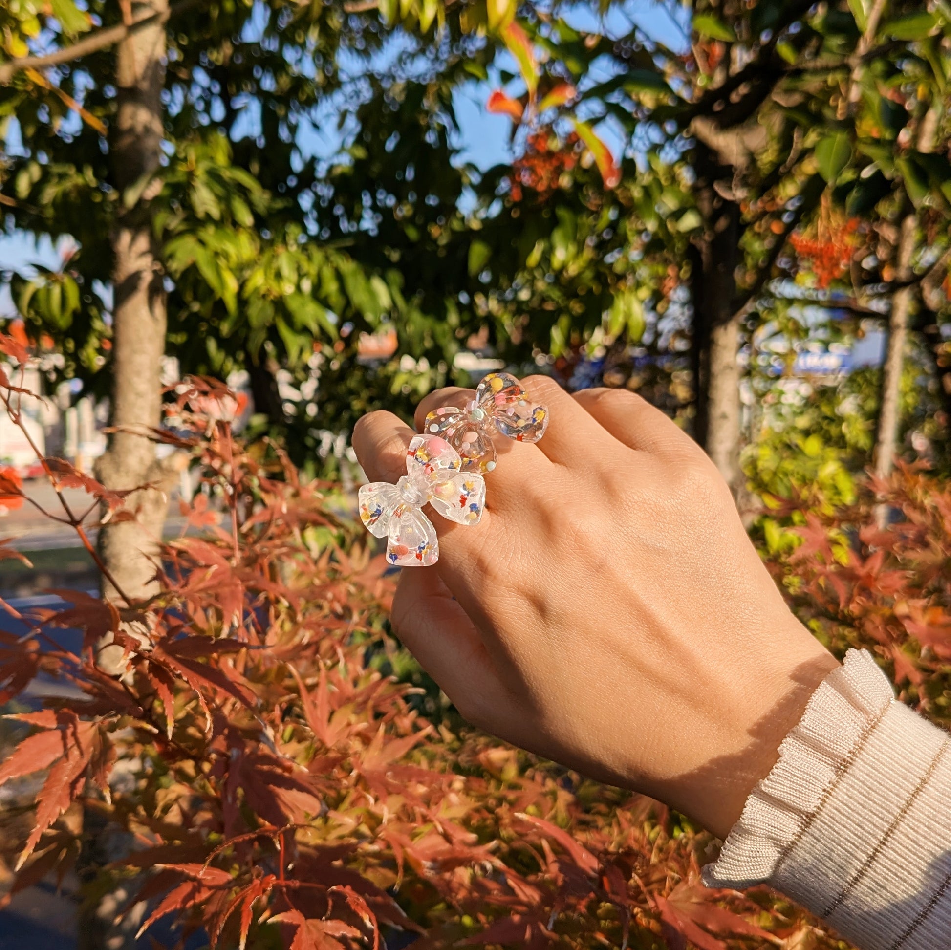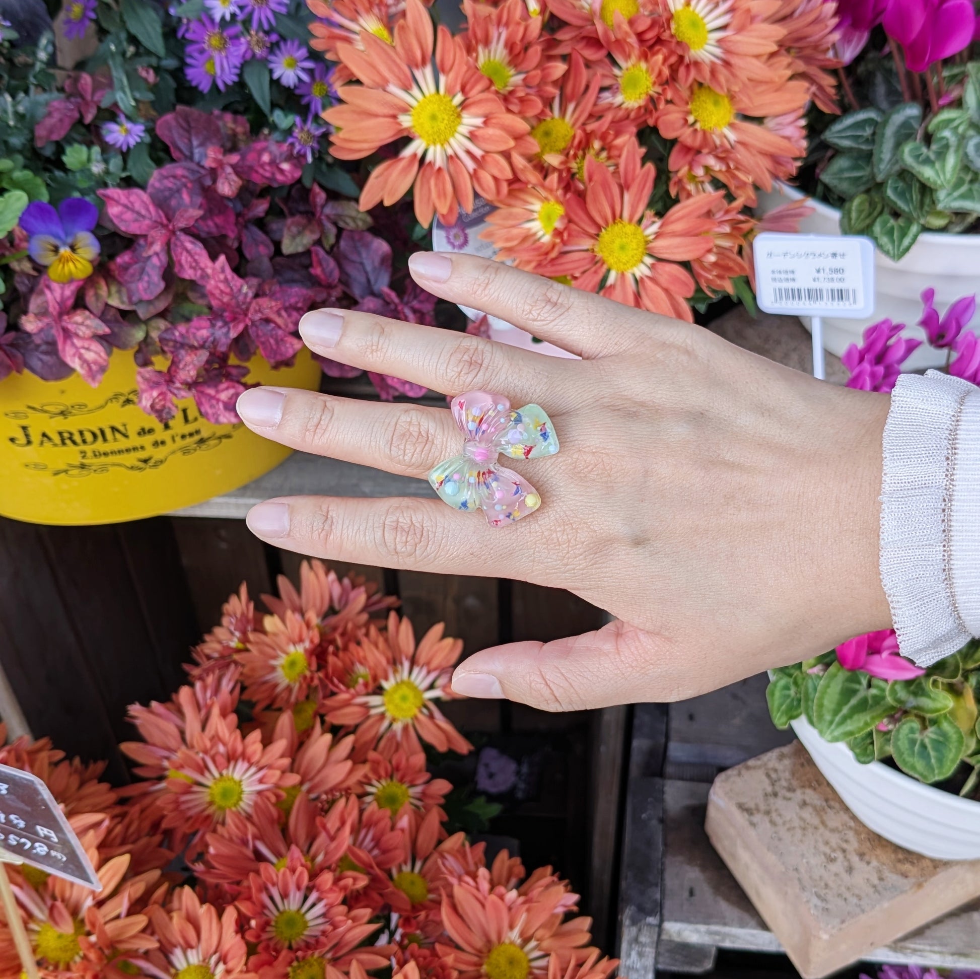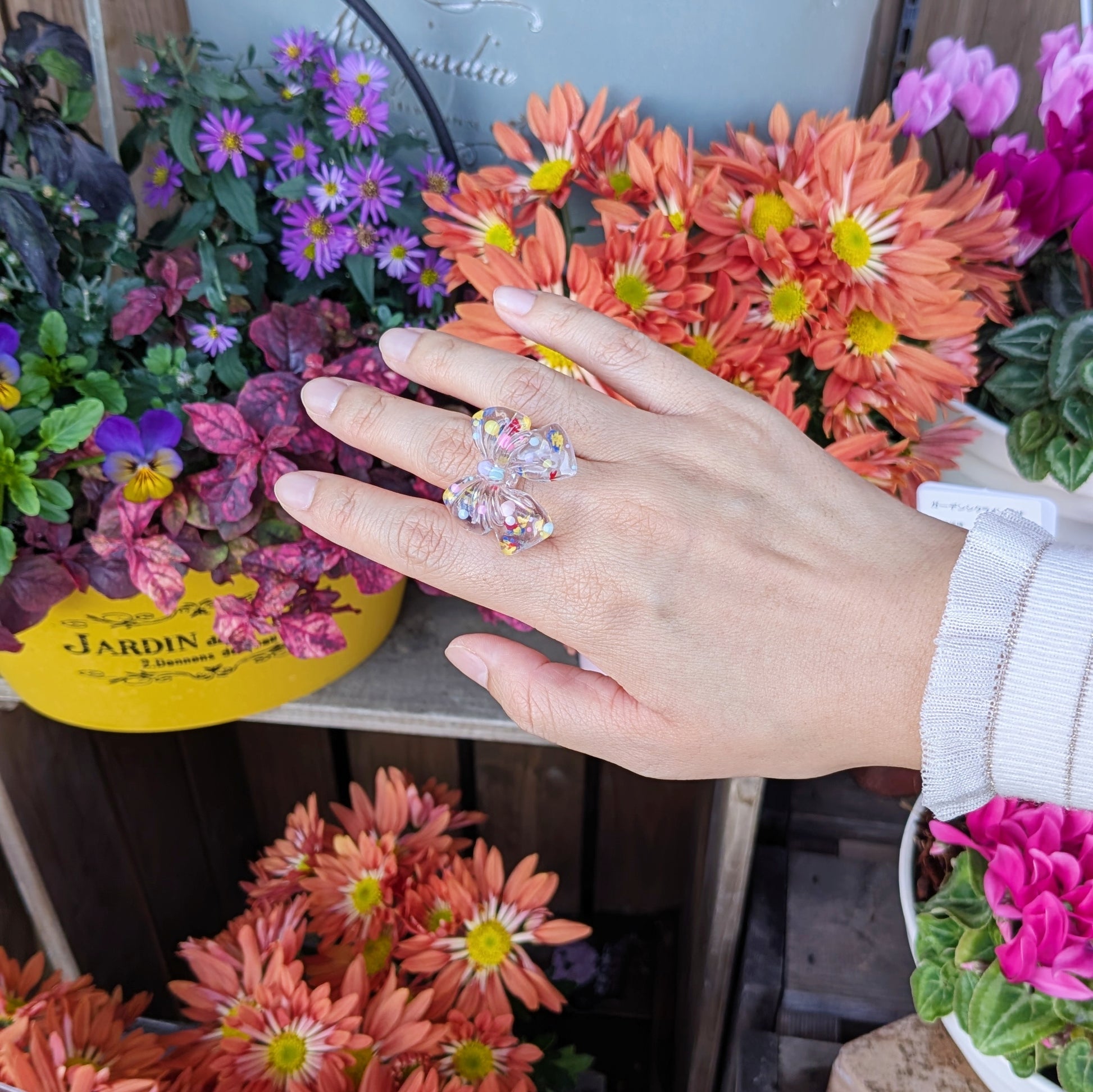 透明感のあるクリア素材に、ふわっと舞うようなカラフルなドットを閉じ込めた “キャンディみたいに可愛い”ハンドメイドリング。